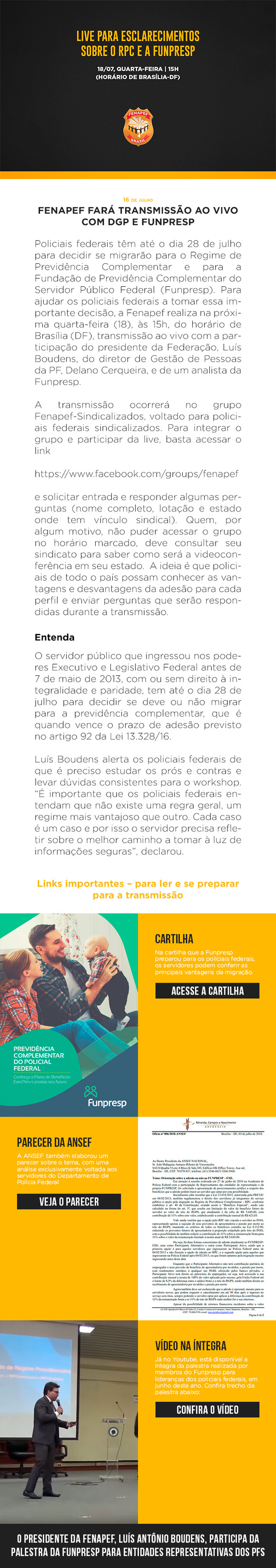 FenapefFENAPEF fará transmissão ao vivo com DGP e FUNPRESP sinpefpb8 anos ago0 Comments961 Min Read FacebookTwitterLinkedInPinterestStumbleuponEmail Share Policiais tem até o dia 28 de Julho para decidir se migrarão… Confira os vídeos 001 e 002 na íntegra. Acesse a CARTILHA. Veja o PARECER. Mais informações no FACEBOOK. Share FacebookTwitterLinkedInPinterestStumbleuponEmail