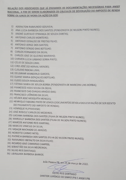 Segue a relação dos colegas que já enviamos os seus documentos para à ANSEF NACIONAL, a fim de efetuarem os cálculos dos valores que serão executados, da devolução dos valores do imposto de renda que foram pagos sobre os juros de mora, quando do recebimento dos precatórios da ação da GOE.