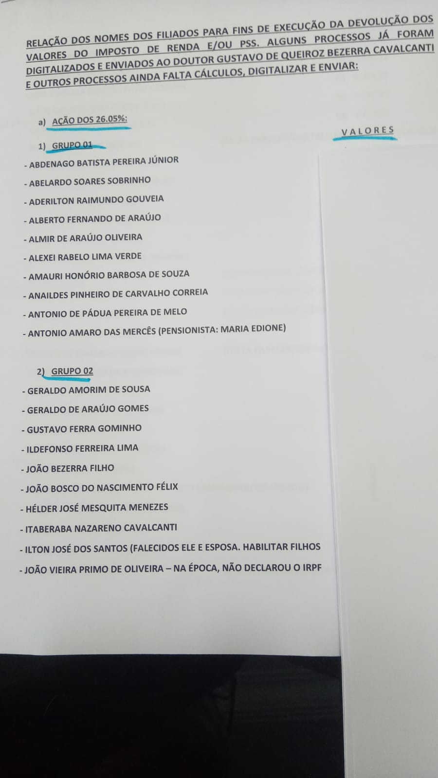 Acabamos de atualizar a relação dos filiados que já trouxeram as documentações necessárias para execução da devolução do imposto de renda e/ou PSS, para quem recebeu precatórios e/ou RPV, do período de 2002 a 2012. Na relação constam os valores dos colegas, mas não iremos divulgar.